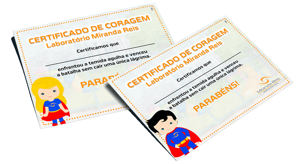 Para encorajar as crianças a realizarem as coletas, nós entregamos o Certificado de Coragem para todas que vencem a batalha pelo bem da saúde. Aqui no Miranda Reis o afeto e o acolhimento deixam tudo mais tranquilo para as suas amadas crianças.